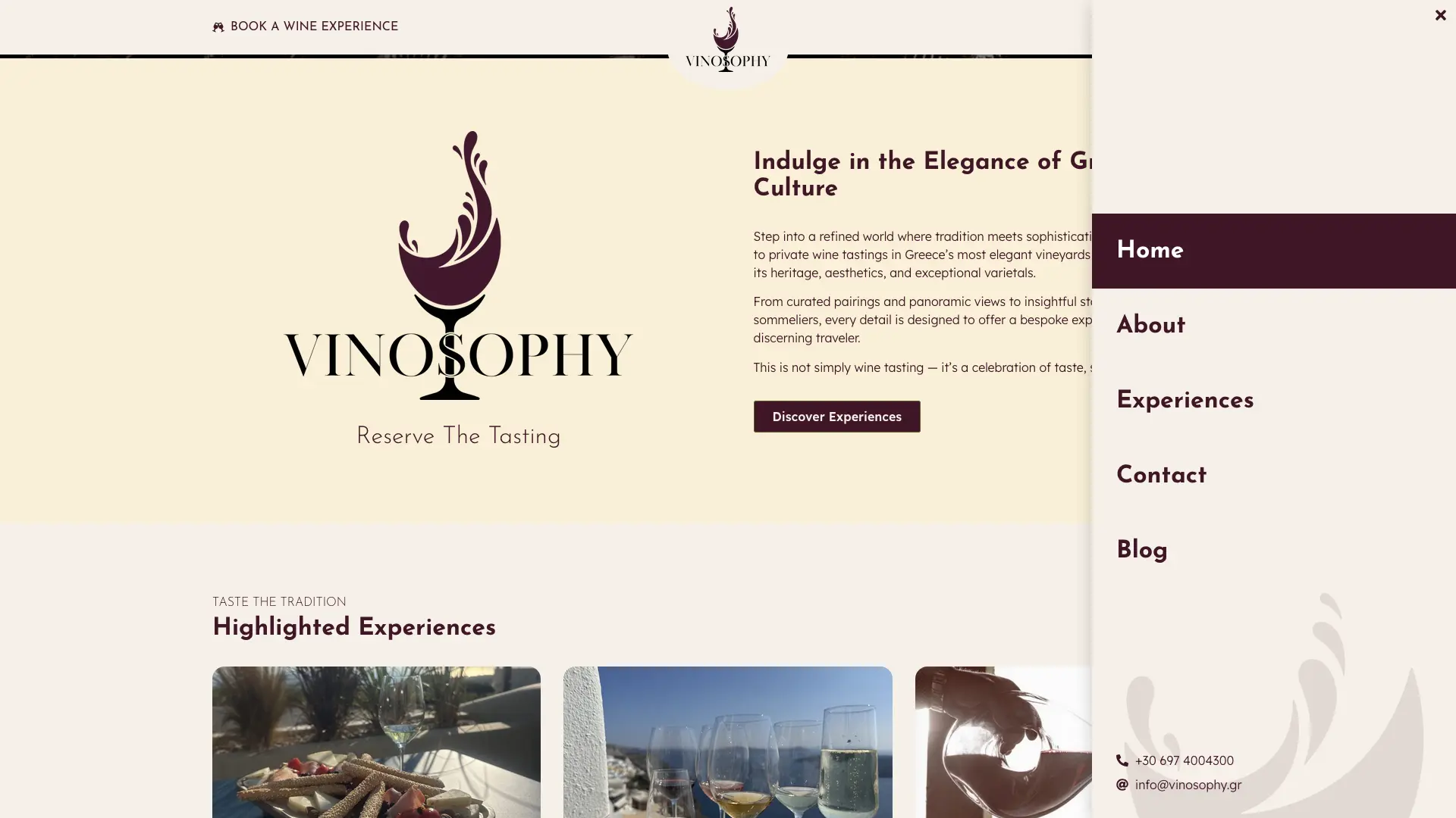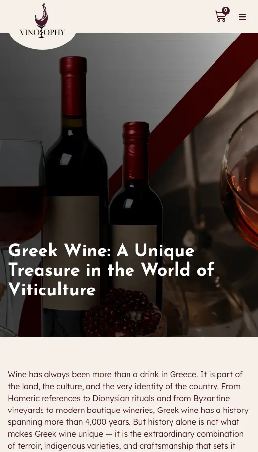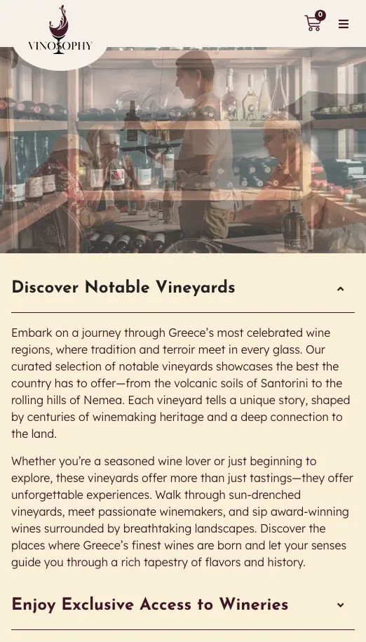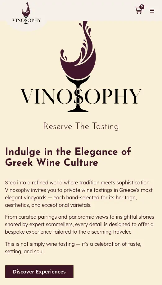 Vinosophy is a custom WordPress website built to showcase Greece’s wine culture through curated tasting experiences, passionate local hosts, and an integrated wine marketplace. The platform combines storytelling with functionality, featuring bespoke custom post types for Experiences, Profiles, and Testimonials, alongside WooCommerce for direct wine sales. Emphasis was placed on clarity, usability, and atmosphere—allowing visitors to quickly grasp key details while also diving deeper into rich descriptions, highlights, and practical information. The result is a scalable, content-driven website that balances elegance and performance, designed to turn wine discovery into a memorable online experience.